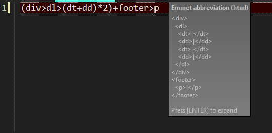 The editor allows you to type simple abbreviations and expand them into complex code. E.g. the abbreviation "!" or "html:5" will expand into a complete HTML 5 document.