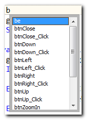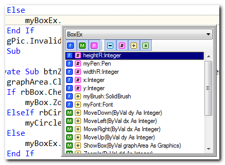 In this example we use a VB .NET project. We want to access the class members of a object called myBoxEx. So we type "myBoxEx." and add the period at the end to invoke a completion list.