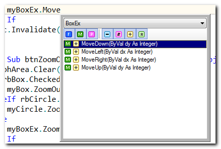 We type "myBoxEx.Move" and press Ctrl+J