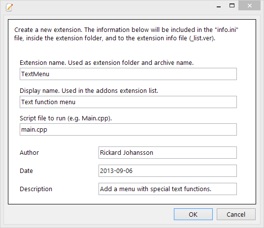Enter extension name, display name, name of main script file, author, date and description. Press OK when done. A new sub folder is created in the extension folder using the extension name above. The main file is also created and opened when you hit OK.
