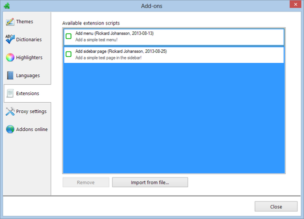 Users will add the extension in "Addons -> Extensions". If found in the forum, use "Import from file..." and select the .zip file. The "MyExtension" folder will be created and all information from the "info.ini" file is imported.