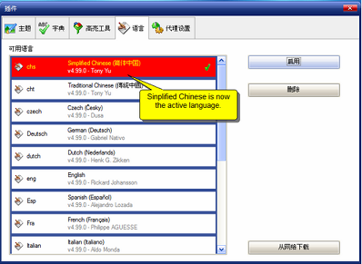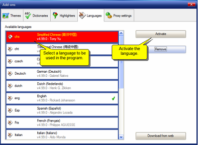 The program can use language files to support different languages. Use the add-ons dialog to change language used.