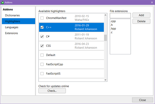 To handle highlighters (syntax file), open the "Addons" window. Here you can activate/deactivate highlighters and change the file extensions the highlighter use to identify the source language.