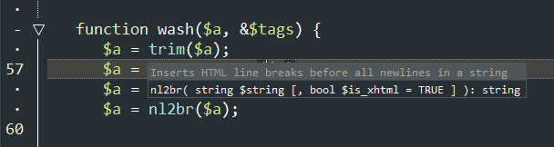 The body contains the function and a short description is displayed in the header. The function "nl2br(...)" is used to identify and find the hint.