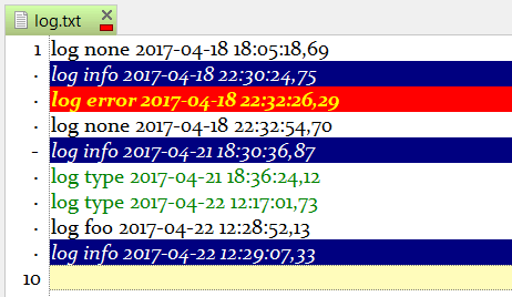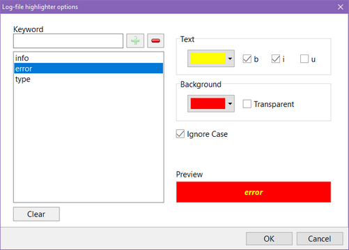 In the simple example above the keywords "info", "error" and "type" have highlighter options attached to them.