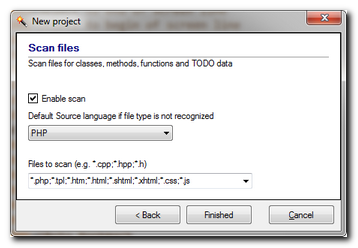 Page 2: Here you can enable scan of project files for classes, methods, functions, todo items and notes. If the file type is not recognized, you can set a default source language.