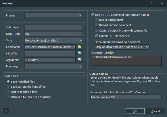 To add a tool or a script select the menu item "Tools->Configure Tools...". In the options dialog window click on the "Add" button. Now the window below is displayed.