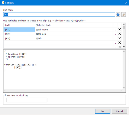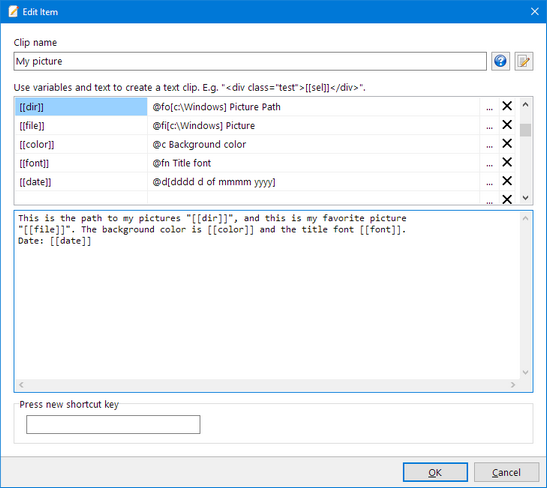 Type a name for the clip, add text and variables. You can click on the [...] buttons to insert variables and variable commands.