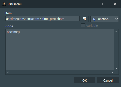 Press "Add" to open the dialog box seen below. The "item" and "icon" are displayed in the user menu list when opened. And "code" is the text that is inserted in the editor when selected.